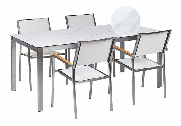 Udělejte ze své zahrady či terasy stylové místo ke stolování s nejbližšími. Stůl je vyroben z nerezavějící oceli, kterou doplňuje stolová deska z tvrzeného skla v nadčasové bílé barvě s mramorovým vzhledem. Díky přirozené odolnosti vůči UV záření, vodě a rzi je ideální volbou do moderních venkovních prostor. Velká stolová deska poskytuje dostatek místa pro 6 osob, takže pořádání větších oslav bude snadné. Součástí jídelní sestavy jsou 4 židle s textilními opěradly a sedadly, které zvýrazňují moderní vzhled nábytku a poskytují pohodlné místo k sezení.