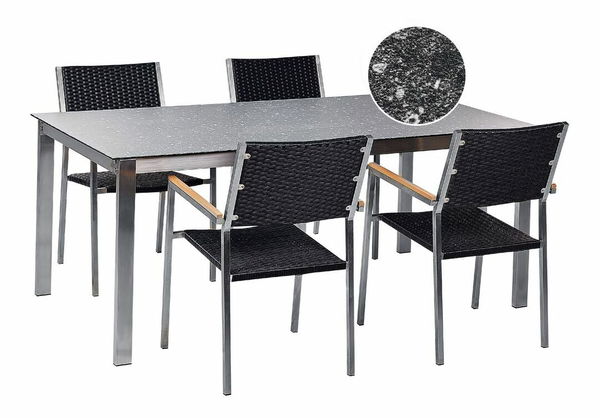 Udělejte ze své zahrady či terasy stylové místo ke stolování s nejbližšími. Stůl je vyroben z nerezavějící oceli, kterou doplňuje stolová deska z tvrzeného skla v nadčasové černé barvě. Díky přirozené odolnosti vůči UV záření, vodě a rzi je ideální volbou do moderních venkovních prostor. Velká stolová deska poskytuje dostatek místa pro 6 osob, takže pořádání větších oslav bude snadné. Součástí jídelní sestavy jsou 4 židle z umělého ratanu, které zvýrazňují moderní vzhled nábytku a poskytují pohodlné místo k sezení.