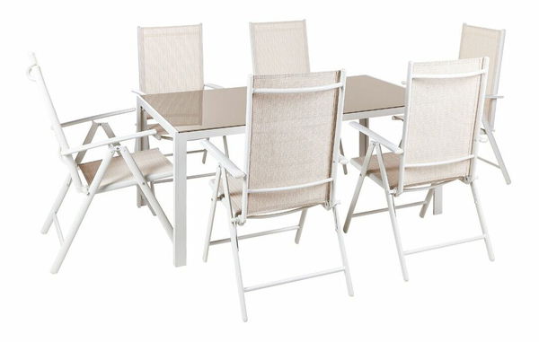 Tato praktická venkovní jídelní souprava, sestávající z jídelního stolu a soupravy šesti židlí, je nezbytným doplňkem každé moderní zahrady nebo terasy. Pevné hliníkové rámy s práškovým lakováním jsou výjimečně odolné a vydrží každodenní používání. Stolová deska z tvrzeného skla má sofistikovaný vzhled a jemně zvýrazňuje rám stolu. Textilní tkanina židlí je pružná a příjemná na dotek, zatímco hluboká sedadla s vysokými opěradly a područkami jsou zárukou pohodlného sezení. Tato zahradní souprava odolná vůči různým povětrnostním vlivům je výjimečným kouskem, který vám bude sloužit dlouhá léta.