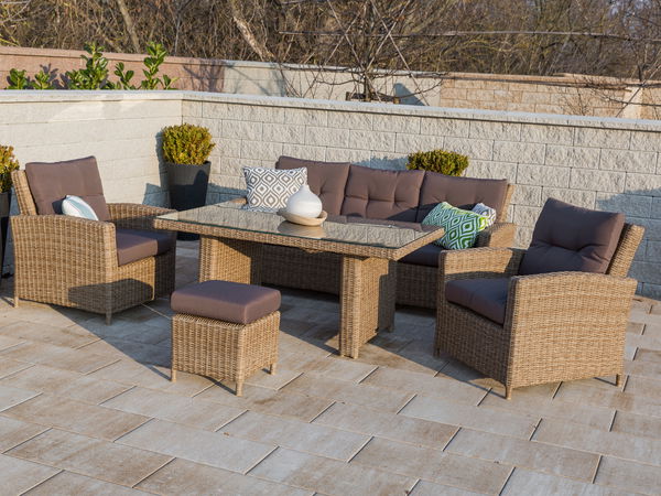 Moderní zahradní nábytek z umělého ratanu v přirozených barvách bude hvězdou v každé zahradě. Umělý ratan a svařovaná hliníková konstrukce jsou nenáročné na údržbu, odolné vůči UV záření, mrazu, vysokým teplotám i jiným vlivům počasí. S nábytkem se snadno manipuluje a má dlouhou životnost. Stolovou soupravu San Marino classic natur oceníte při klidných víkendech s rodinou nebo posezeních s přáteli. Sada se skládá z 3 - sedačky, 2 křesel, taburetky a stolu s bezpečnostním sklem. Ke stolu se tak pohodlně usadí až 6 lidí. Cítit se pohodlně budete i zásluhou měkkých a příjemných opěrek na záda a sedáků. Pokud chcete elegantní, kvalitní a praktický zahradní nábytek souprava San Marino vás určitě nezklame.