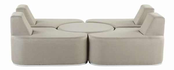 Tato minimalistická sedací souprava se skládá ze čtyř křesel a kulatého taburetu a je ideální do moderně zařízeného venkovního prostoru. Souprava je čalouněna kvalitní polyesterovou látkou odolnou proti UV záření a je vhodná pro použití v interiéru nebo exteriéru. Křesla lze používat samostatně nebo je spojit a vytvořit z nich pohodlné pohovky nebo zahradní postel. Praktický taburet vám poslouží nejen jako další místo k sezení, ale také jako podnožka či konferenční stolek.