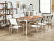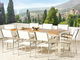 Exkluzivní zahradní sada, která dodá vaší zahradě nebo terase stylový vzhled. Vyznačuje se krásnou kombinací nerezavějící oceli a přírodního eukalyptového dřeva pro moderní vzhled. Vrchní deska stolu je odolná vůči povětrnostním vlivům a světlá barva dřeva dokonale ladí se stříbrným rámem. Ocelový rám je odolný, což zaručuje dlouhou životnost nábytku. Židle, které lze stohovat, mají pevný rám a sedadla a opěradla vyrobená z materiálu odolného vůči UV záření.