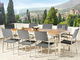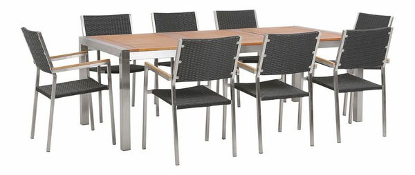 Exkluzivní zahradní souprava, která dodá vaší zahradě nebo terase stylový vzhled Vyznačuje se krásnou kombinací nerezavějící oceli a přírodního eukalyptového dřeva pro moderní vzhled Vrchní deska stolu je odolná vůči povětrnosti stohovat, mají pevný rám a sedadla a opěradla vyrobená z ratanu odolného vůči UV záření.