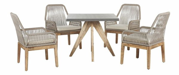 Díky této elegantní soupravě vytvoříte na své terase dokonalý venkovní jídelní kout. Souprava se skládá z prostorného stolu a 4 proutěných židlí. Deska stolu je vyrobena z vláknitého cementu, který je odolný a snadno se udržuje. Podstavce stolu a židlí jsou vyrobeny z pevného akáciového dřeva, které zajišťuje stabilitu všech kusů nábytku, a také vytváří jedinečnou barevnou kombinaci. Vrchní část židlí je vyrobena ze syntetického proutí a všechny z nich jsou vybaveny pohodlným sedacím polštářem.