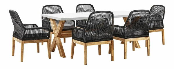 Díky této elegantní soupravě vytvoříte na své terase dokonalý venkovní jídelní kout. Souprava se skládá z prostorného stolu a 6 proutěných židlí. část židlí je vyrobena ze syntetického proutí a všechny z nich jsou vybaveny pohodlným sedacím polštářem.