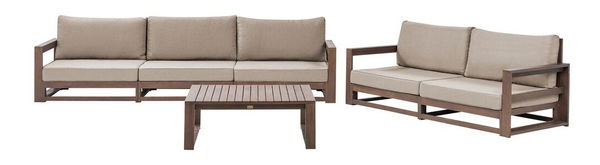 Tato klasická zahradní sedací souprava se dodává s konferenčním stolkem a sedacími částmi, které lze použít společně nebo samostatně. Je vyrobena z kvalitního akáciového dřeva v krásném tmavém odstínu a je ideální k odpočinku v zahradě či na terase. Díky hrubým polštářům na sedadle a opěradle v příjemném odstínu a nízkému rámu je ideálním kusem nábytku pro každou moderní zahradu nebo terasu.