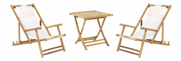 Tato souprava pro dvě osoby, která je skvělá pro relaxaci na balkoně nebo v zahradě, upoutá pozornost svým nadčasovým designem a funkčností. Souprava je vyrobena z bambusového dřeva ve světlém, přírodním odstínu, díky čemuž soupravu dokonale zapadne do jakéhokoli rustikálního nebo boho prostředí. Lehátka a stůl lze složit, takže při uskladnění ušetříte spoustu místa a také je v případě potřeby velmi jednoduše přemístíte. Lehátka mají látkový potah s polštářem pod hlavu a opěradla lze nastavit dle potřeby do 3 různých poloh.