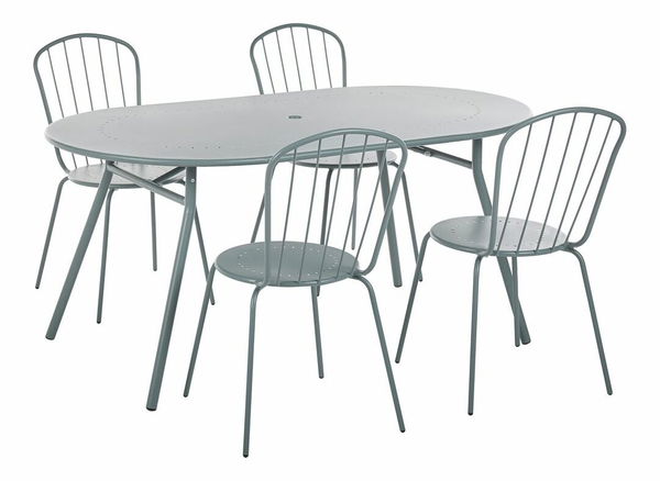Tato stylová jídelní souprava je praktickým doplňkem do jakéhokoli venkovního prostředí. Umožňuje vám vychutnat si jídlo pod širým nebem nebo jen tak relaxovat s přáteli či příbuznými. Je vyrobena z nerezavějícího kovu, odolá nepříznivým povětrnostním podmínkám a intenzivnímu používání, a zároveň se snadno čistí. Souprava se dodává se čtyřmi kovovými židlemi a její praktičnost navíc zvyšuje otvor pro slunečník uprostřed vrchní desky stolu. Nadčasový design působí jednoduše, ale zároveň stylově a dodá vaší zahradě nevšední atmosféru.