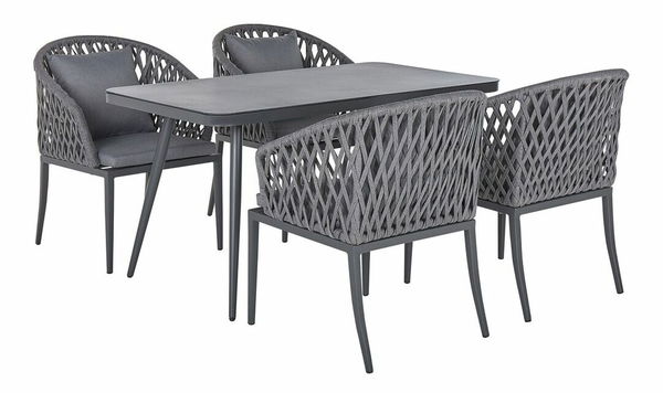 Dodejte své zahradě svěží atmosféru pomocí této jídelní soupravy v moderním designu. Sestává z velkého stolu a čtyř židlí, které vyniknou zejména ve venkovních prostorách laděných v tradičním, minimalistickém či moderním stylu. Všechny kusy z této soupravy mají pevný hliníkový rám, který zaručuje stabilitu a odolnost po dlouhá léta. Lanová opěradla a měkké sedací polštáře zaručují optimální pohodlí během sezení, zatímco prostorná stolová deska poskytuje dostatek místa až pro čtyři osoby.