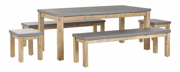 Pokud máte rádi industriální styl a stolování pod širým nebem, tato sada je pro vás výbornou volbou. Sada se skládá ze stolu, dvou lavic a dvou židlí. Vrchní část stolu a sedací části z vláknitého cementu jsou doplněny dřevěnými podstavci. Pevné a robustní akáciové dřevo v přírodním provedení zaručují odolnost a zároveň nabízí klasický vzhled. Soupravu lze umístit do zahrady nebo na terasu, kde si můžete vytvořit dokonalý venkovní jídelní kout až pro osm osob.