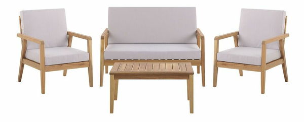 Tato čtyřdílná sada připraví vaši zahradu na všechna rodinná a přátelská setkání. Sada zahrnuje konferenční stolek doplněný dvěma křesly a pohovkou, všechny s doladěnými polštáři na sedadla a opěradla. Hrubá výplň polštářů zajišťuje pohodlí během sezení a díky vázacím páskům polštáře snadno připevníte k rámu. Dřevěný nábytek má nadčasové kouzlo a univerzální vzhled, takže se dobře hodí do venkovního prostoru, ale také do obývacího pokoje či na terasu.