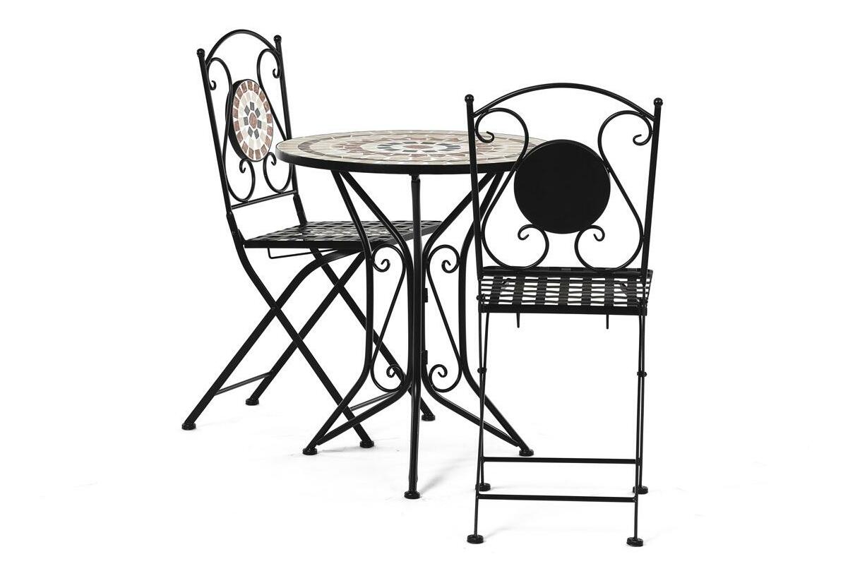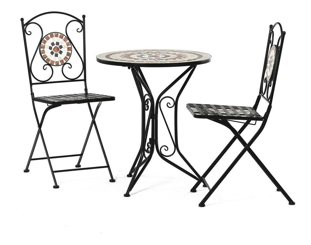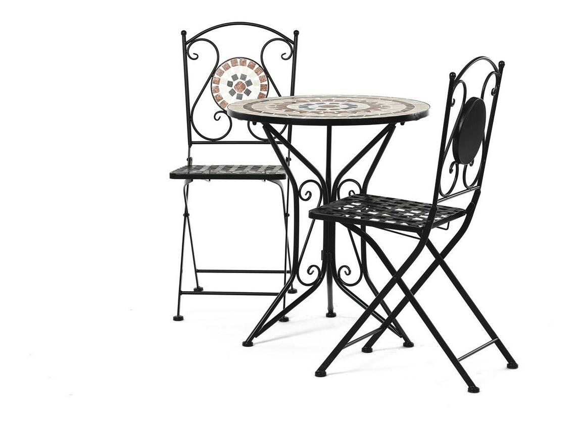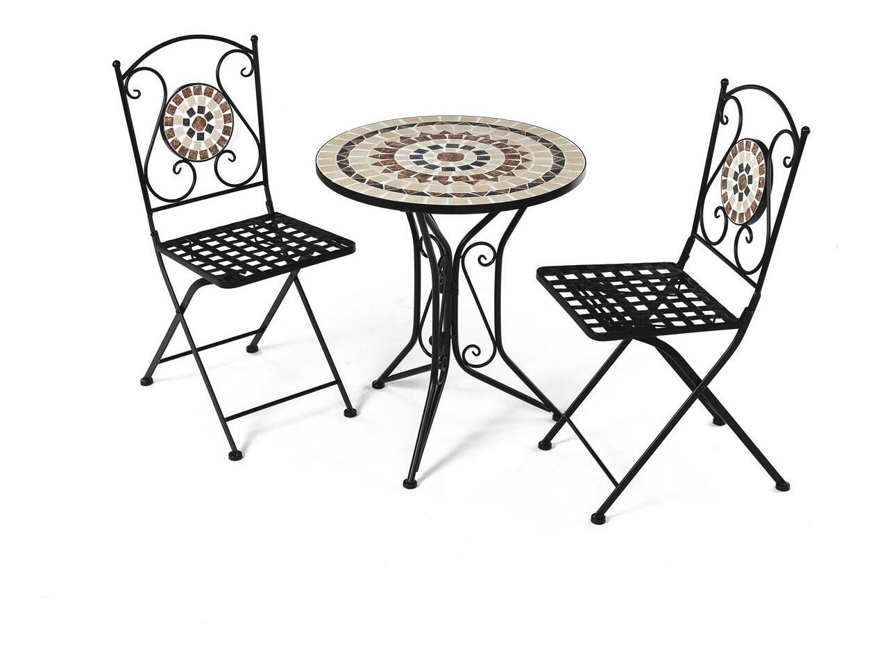 ZobrazitElegantní zahradní set je ideální volbou pro váš venkovní prostor. Tento set obsahuje stylový kulatý stolek s kamennou mozaikou a dvě skládací židle, které se snadno uskladní. Černý kovový rám v kombinaci s provensálským designem přináší do vaší zahrady nebo na terasu nádech elegance a útulnosti. Židle i stolek jsou vyrobeny z odolného kovu, což zajišťuje dlouhou životnost a stabilitu. Tento zahradní nábytek je perfektním doplňkem pro pohodové chvíle strávené venku.