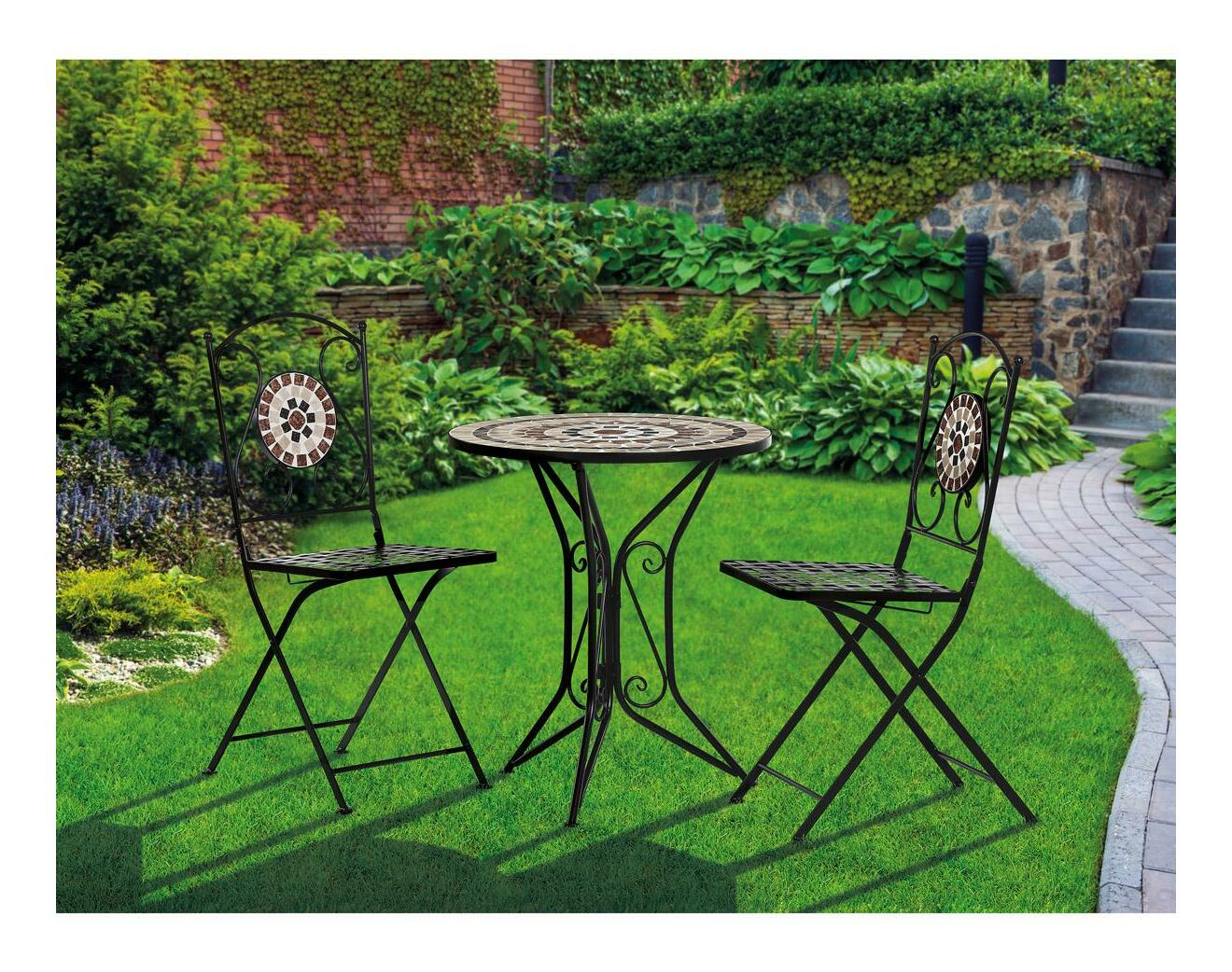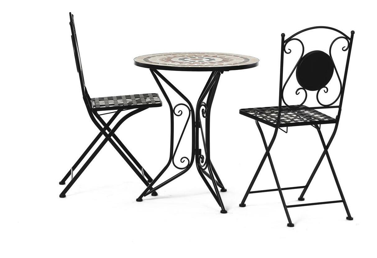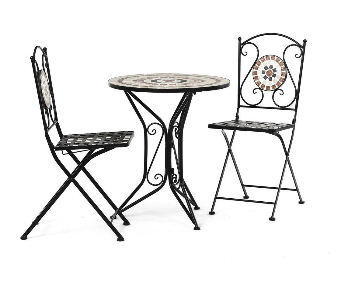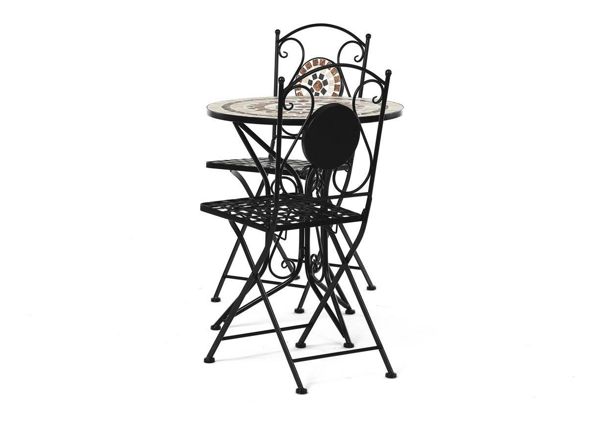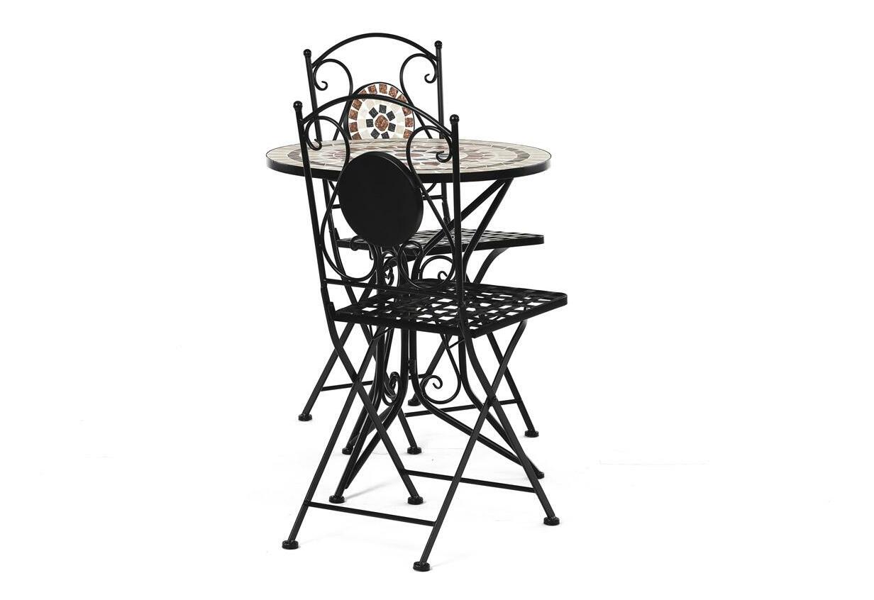 ZobrazitElegantní zahradní set je ideální volbou pro váš venkovní prostor. Tento set obsahuje stylový kulatý stolek s kamennou mozaikou a dvě skládací židle, které se snadno uskladní. Černý kovový rám v kombinaci s provensálským designem přináší do vaší zahrady nebo na terasu nádech elegance a útulnosti. Židle i stolek jsou vyrobeny z odolného kovu, což zajišťuje dlouhou životnost a stabilitu. Tento zahradní nábytek je perfektním doplňkem pro pohodové chvíle strávené venku.