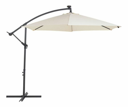 Relaxujte během slunečných dnů pod tímto stylovým konzolovým deštníkem ve své zahradě. Stabilní hliníková tyč s klikou umožňuje rychlé otevírání a skládání za účelem skladování. Velká střecha je vodotěsná a nastavitelná. Malá LED světla připevněná k příčníkům jsou poháněna sluneční energií a poskytují teplé a jemné světlo, které je ideálním doplňkem večerních setkání.