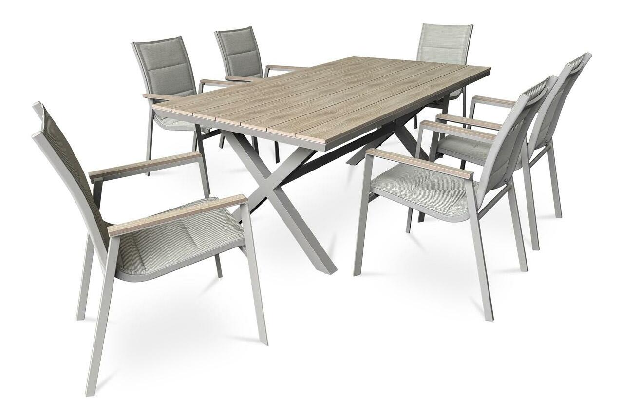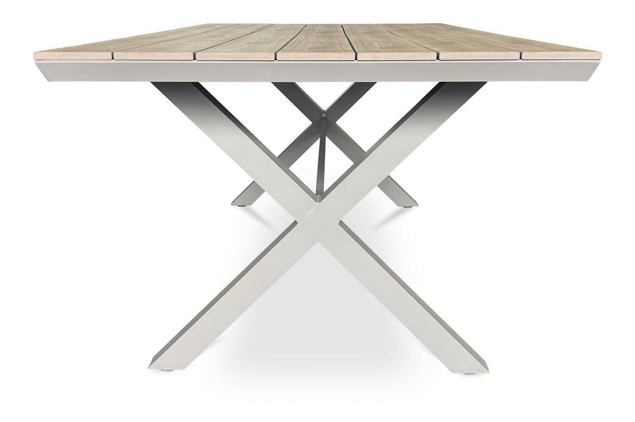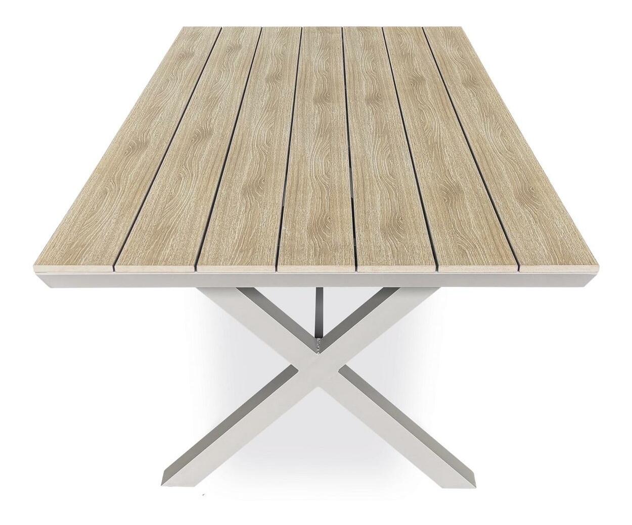 Zahradní stůl je ideální volbou pro venkovní posezení. Hliníkový stůl moderního designu, s deskou z polywoodu v odstínu světlého dubu skvěle zapadne do každého vnějšího prostoru. Díky hliníkové podnoži je stabilní a zároveň lehký, což usnadňuje jeho manipulaci. Hliníková konstrukce se na slunci nenahřívá a nehrozí při ní koroze ani po letech používání. Tento zahradní stůl je vyroben tak, aby Vám zaručil dlouhou životnost i v náročných podmínkách. Perfektně se hodí do každé zahrady nebo na terasu, kde vytvoří příjemné místo pro setkávání s rodinou a přáteli.