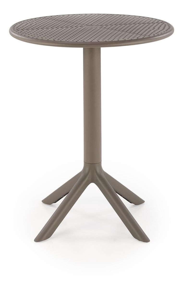 Tento malý, moderní zahradní stolek je ideální volbou pro jednotlivce, který si potrpí na funkčnost a styl. Deska stolu i nohy jsou vyrobeny z polypropylenu, což zajišťuje snadnou údržbu a odolnost vůči poškození. Stůl má jednu centrální nohu, která se rozvětvuje na čtyři stabilní opory, zabezpečující pevnost a rovnováhu. Kulatý tvar stolu optimalizuje prostor, umožňuje snadný přístup z každé strany a zároveň nabízí dostatek plochy pro pohodlné stolování pro jednu osobu. Tento stolek není rozkládací, což jej činí vhodným pro každodenní použití v menších prostorách, jako jsou studia nebo malé kuchyně.