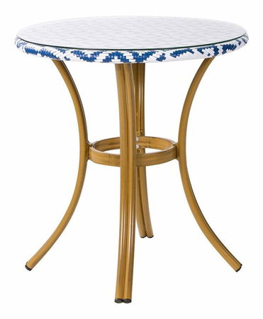 Tento malý stůl s poutavou geometrickou vazbou bude nádherným doplňkem každé terasy, balkonu nebo jídelny. Stolek má hliníkový rám a vrchní desku z umělého ratanu se skleněným povrchem, takže je ideální pro vnější i vnitřní použití. Díky kulatému tvaru se dokonale hodí do menších zahrad nebo místností. Spárujte ho se židlemi ze stejné kolekce a vytvořte si útulné slunečné místo, kde můžete odpočívat.
