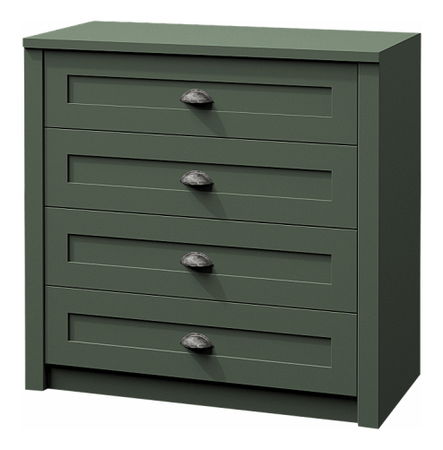 Zásuvková komoda K4 Provense v zelené barvě je skvělým doplňkem do každé domácnosti. S výškou 88 cm a hloubkou 43 cm, nabízí dostatek úložného prostoru pro vaše věci. mm a vrchní deska je tlustá 22 mm. Komoda je vybavena čtyřmi zásuvkami a úchytkami na nich, což umožňuje snadný přístup k vašim věcem. komodou budete mít všechny vaše věci na jednom místě a zároveň přidáte kousek stylu do vašeho domova.