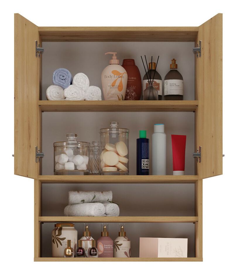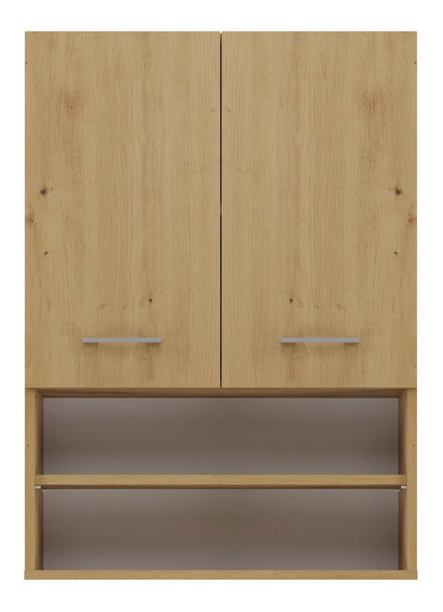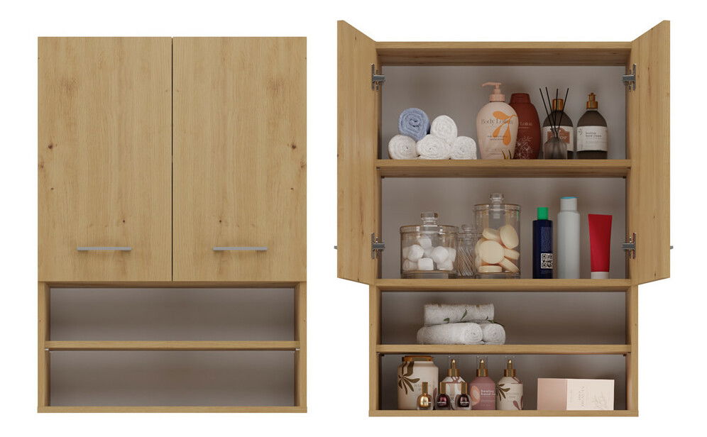 ZobrazitZávěsná koupelnová skříňka Perdieron 1 v elegantní barvě dub artisan je ideálním řešením pro moderní koupelny, kde je třeba efektivně využít prostor. S minimalistickou konstrukcí a dvěma otevřenými poličkami a dvěma skrytými za dveřmi nabízí dostatek úložného prostoru pro všechny potřebné koupelnové doplňky, jako jsou ručníky či čistící prostředky. Skříňka je vyrobena z kvalitní laminované desky o tloušťce 16 mm, což zaručuje její odolnost a dlouhou životnost. Tento praktický nábytek je skvělou volbou pro každou domácnost.