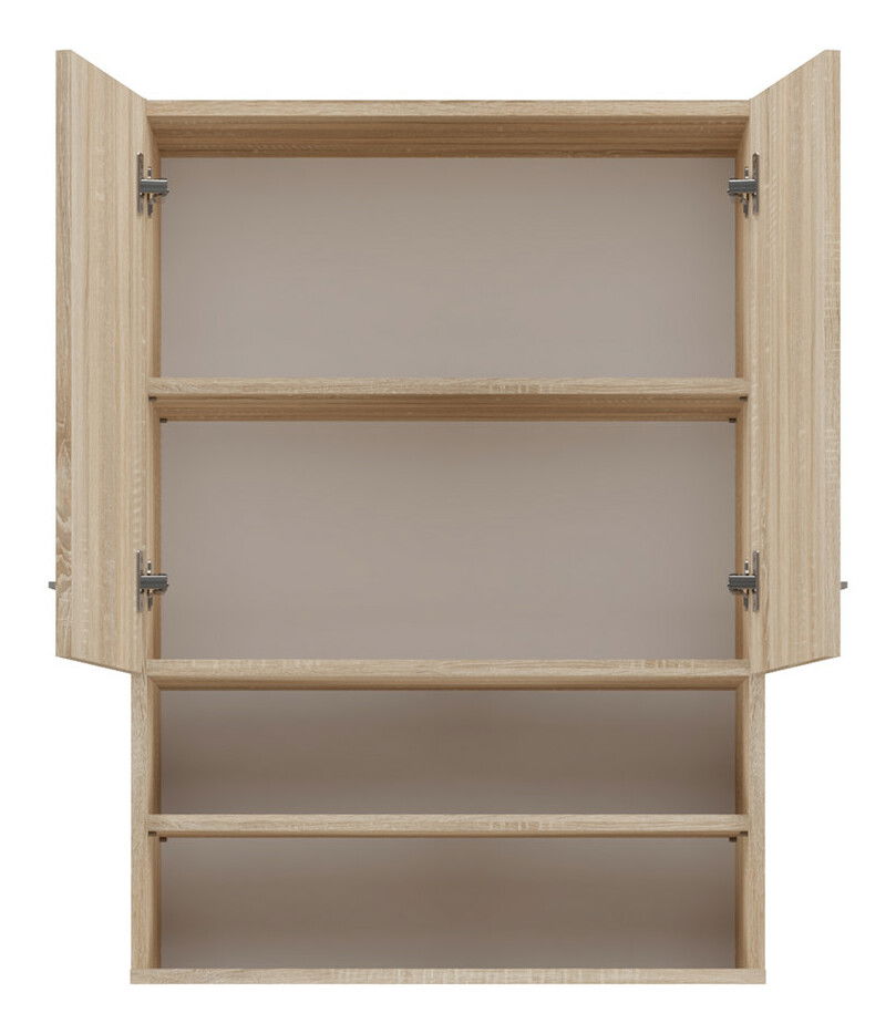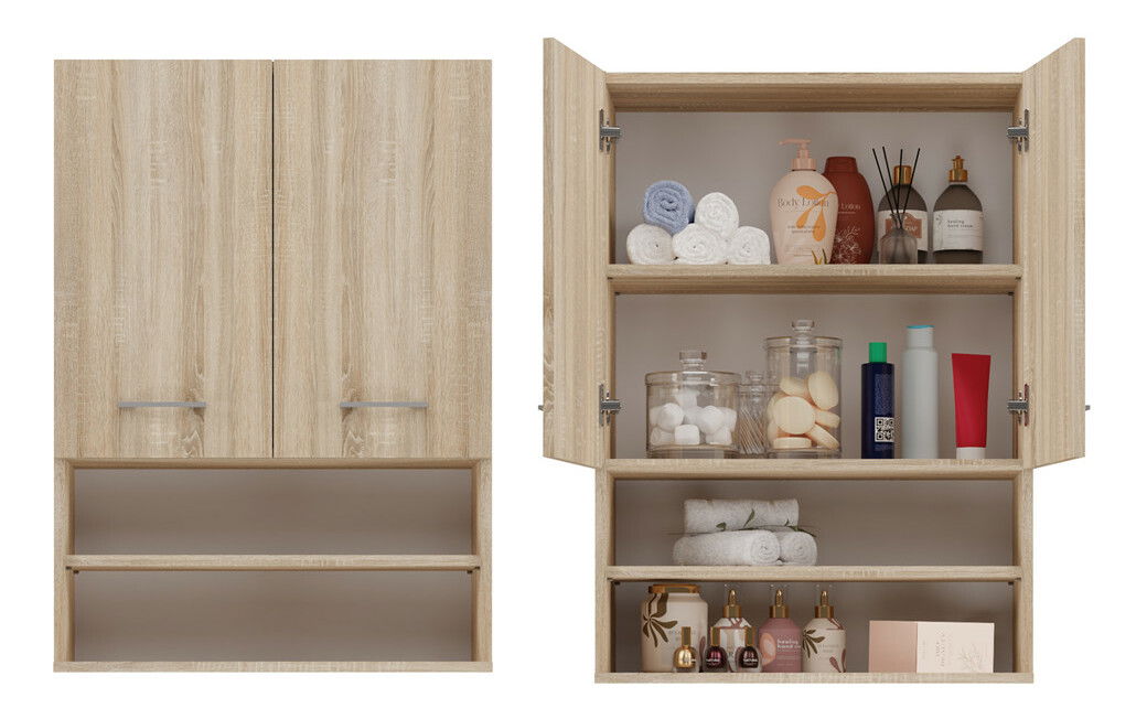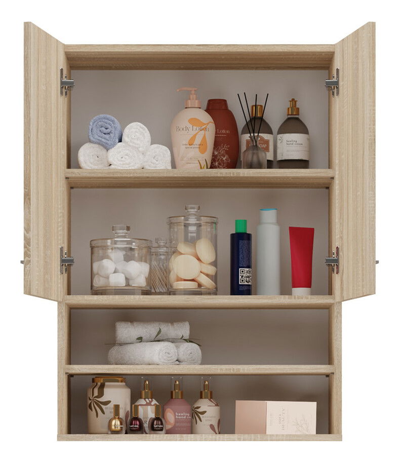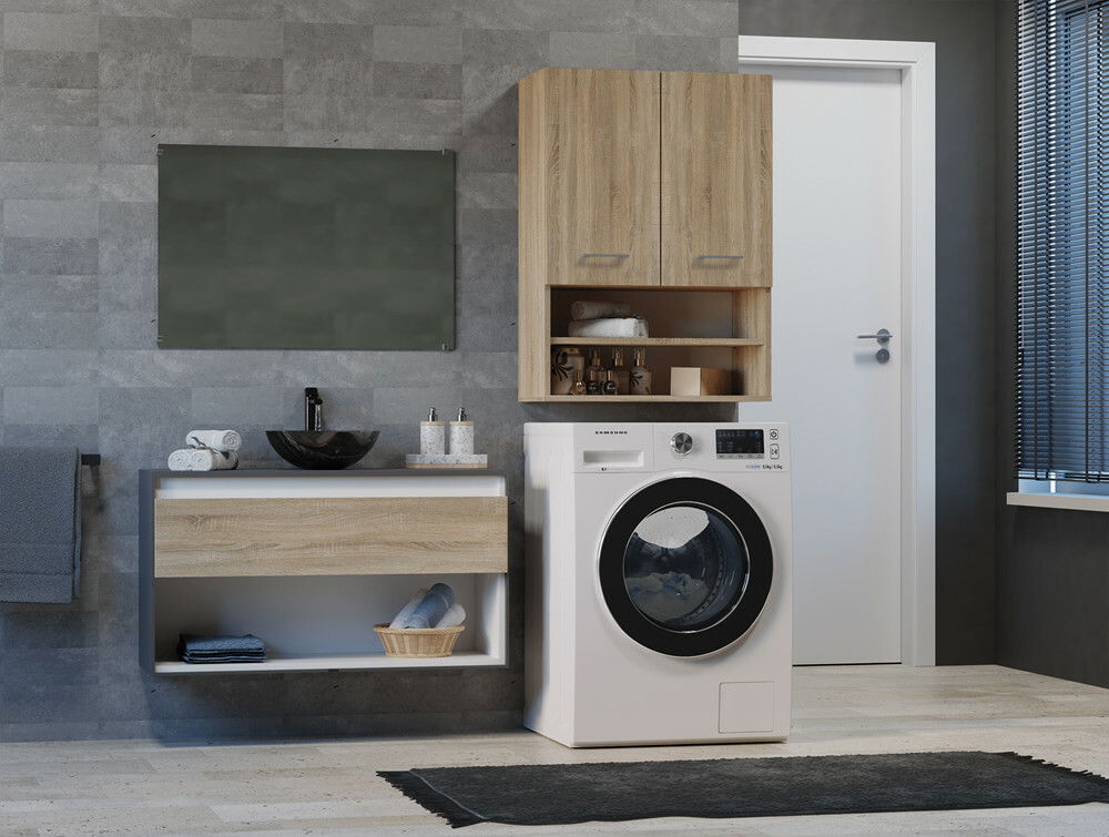 ZobrazitZávěsná koupelnová skříňka Perdieron 1 v elegantní barvě dub sonoma je ideálním řešením pro efektivní využití prostoru nad pralkou. S minimalistickou konstrukcí a moderním designem nabízí dostatek úložného prostoru v podobě dvou otevřených polic a dvou skrytých za dveřmi, což umožňuje přehledné uspořádání všech potřebných koupelnových doplňků. Skříňka je vyrobena z kvalitní laminované desky o tloušťce 16 mm, což zaručuje její odolnost a dlouhou životnost. Tento praktický nábytek je skvělou volbou pro menší koupelny, kde je důležité efektivně hospodařit s prostorem.
