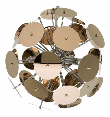 Jedinečně navržená ambientní stropní svítilna, která zvýrazní každý interiér, ať už v industriálním nebo moderním prostředí. S kulovitým tvarem složeným z mnoha kovových disků v lesklé měděné povrchové úpravě odráží přirozené světlo a zrcadlí prostředí, ve kterém je zasazeno. Svítilna se čtyřmi žárovkami umožňuje úplné osvětlení místnosti, zatímco díky svému neobvyklému designu vrhá hravé stíny na stěnách.