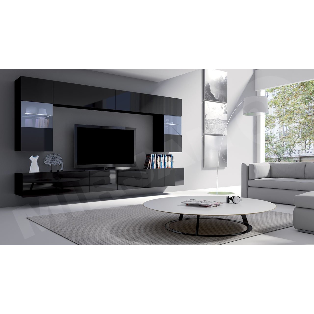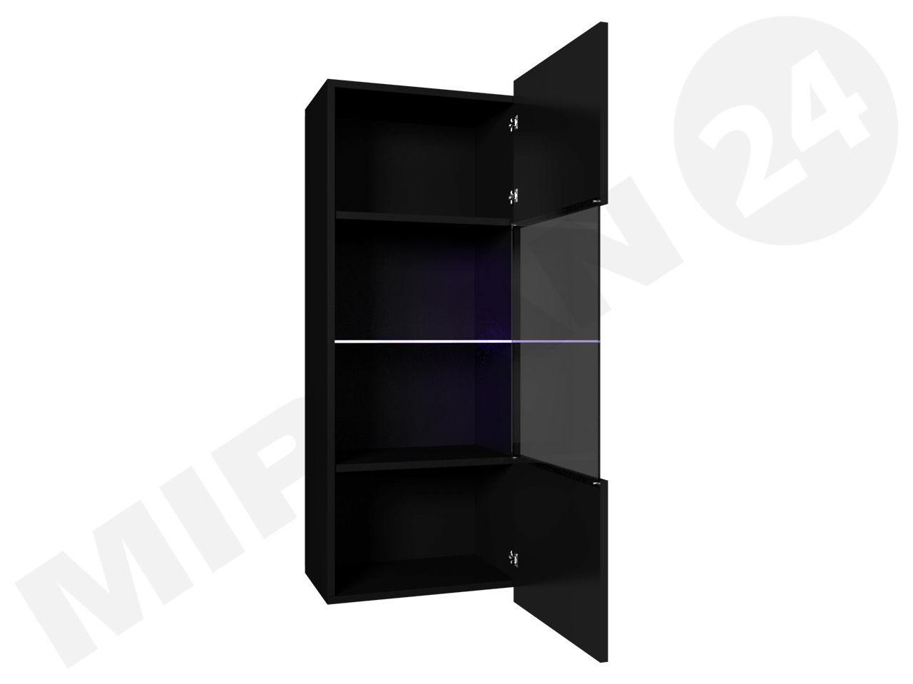Závěsná vitrína Brolani BR11 (černá + lesk černý) (s modrým LED osvětlením)