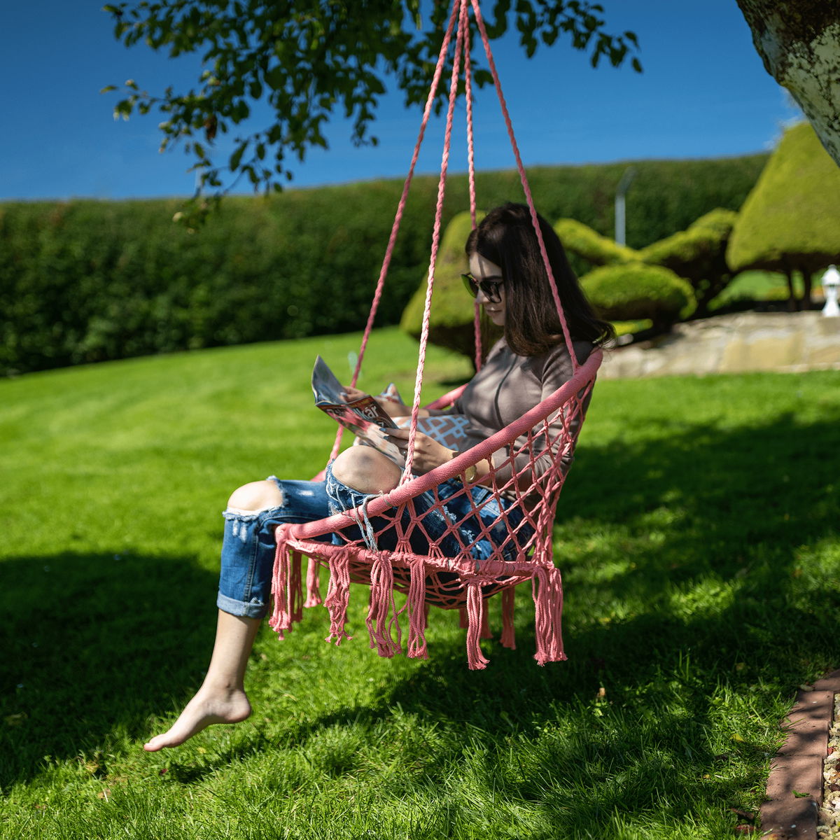 Amari je houpací křeslo, které můžete použít v interiéru i exteriéru. Základ tvoří pevný kovový rám, ke kterému se upevní čtyři závěsná lana. Samotná kovová konstrukce by vám neposkytla žádné pohodlí, bavlněný výplet v bílé barvě dodá křeslu nádech něžnosti, hravosti a estetičnosti. Výplet je z bavlny a polyesteru bílé barvy. Amari s nosností do 120 kg je určeno téměř pro každého.