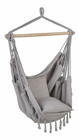 Hezké a funkční závěsné křeslo bude dokonalým doplňkem terasy, balkonu nebo obývacího pokoje. Sedadlo vyrobené z pevné a kvalitní látky je doplněno vkusnými třásněmi, které mu dodávají bohémský nádech. Na jedné straně je malá kapsa ideální pro odložení brýlí nebo knihy. Spolu s přiloženými polštářky vytváří skvělé místo pro čtení a relaxaci. Křeslo se dodává kompletně smontované, zabalené v látkovém sáčku a připravené k použití.