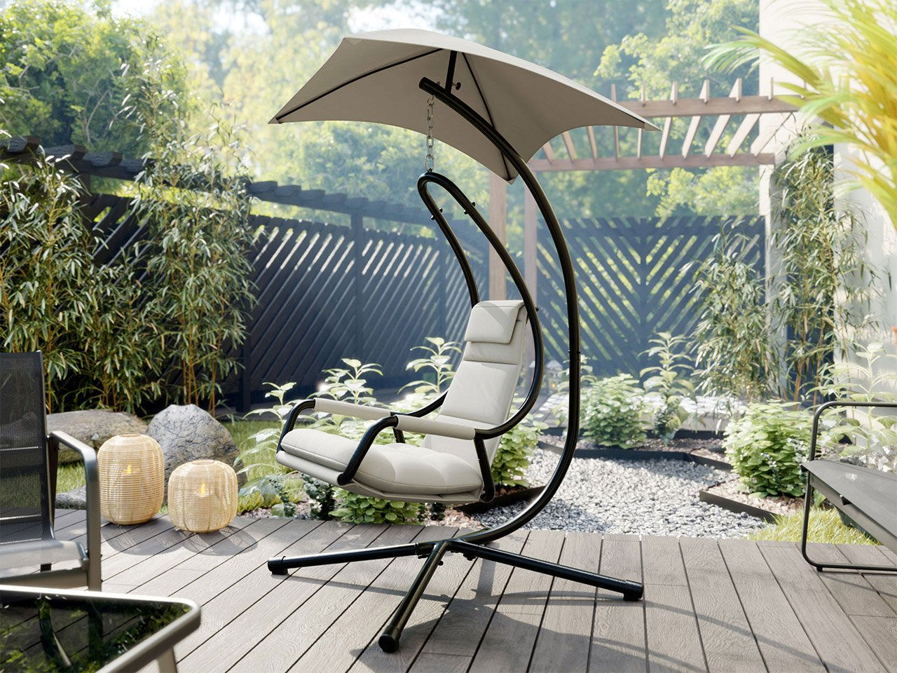 Závěsné křeslo Sotiko je ideální volbou pro ty, kteří hledají pohodlí a styl. Sníte o relaxu obklopeném zelení. Závěsné křeslo Sotiko s baldachýnem je návrhem pro náročné zákazníky. Poskytne vám pohodlný odpočinek a ochranu před sluncem. Skvěle se bude hodit do zahrady i na terasu. Pevná ocelová kostra závěsného zahradního křesla Sotiko znamená bezpečnost a odolnost používání. Měkký a voděodolný polštář z 600D Oxford tkaniny zajistí pohodlné používání. Doporučujeme jej chránit před zimními měnícími se povětrnostními podmínkami (déšť, sníh, mráz). Závěsné zahradní křeslo se jednoduše montuje. Nezapomínejme však, že většinu zahradního nábytku by děti měly používat jen pod dohledem dospělých. Rozměry: šířka: 103 cm, výška: 212 cm, hloubka: 122 cm Provedení: ocelová kostra - zajišťuje bezpečnost a odolnost, tkanina: 180 g/m2 100% voděodolná polyesterová tkanina, sedátko: polštář z 600D Oxford tkaniny, balkon, zahradu nebo dům, doporučuje se chránit před měnícími se povětrnostními podmínkami (déšť, sníh, mráz), snadná montáž, maximální zatížení: 110 kg, děti by měly židli používat pouze pod dohledem dospělé osoby Křeslo je určeno k relaxaci - ne k houpání Záruka: 24 měsíců