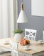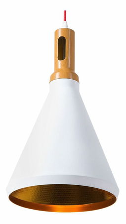 Jednoduchá stropní lampa s jemným industriálním nádechem. Její minimalistické bílé stínítko doplní každý moderní nebo skandinávsky laděný interiér, zatímco díky zlatému vnitřnímu povrchu je světlo jasné a příjemné. Vrchní část lampy je vyrobena ze syntetického materiálu v barvě světlého dřeva, kterou skvěle zvýrazňuje kabel v červené barvě. Lampa se stane elegantním středobodem každé místnosti a krásně vynikne v obývacím pokoji, jídelně nebo kuchyni.