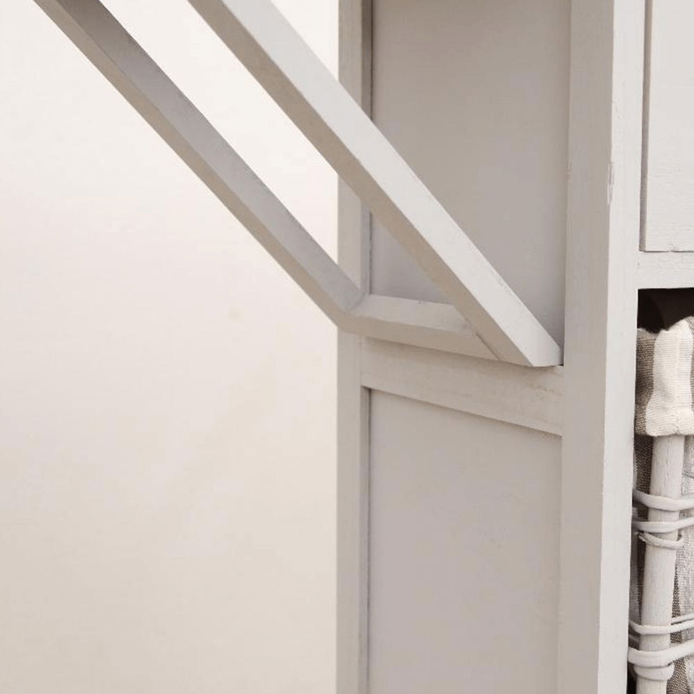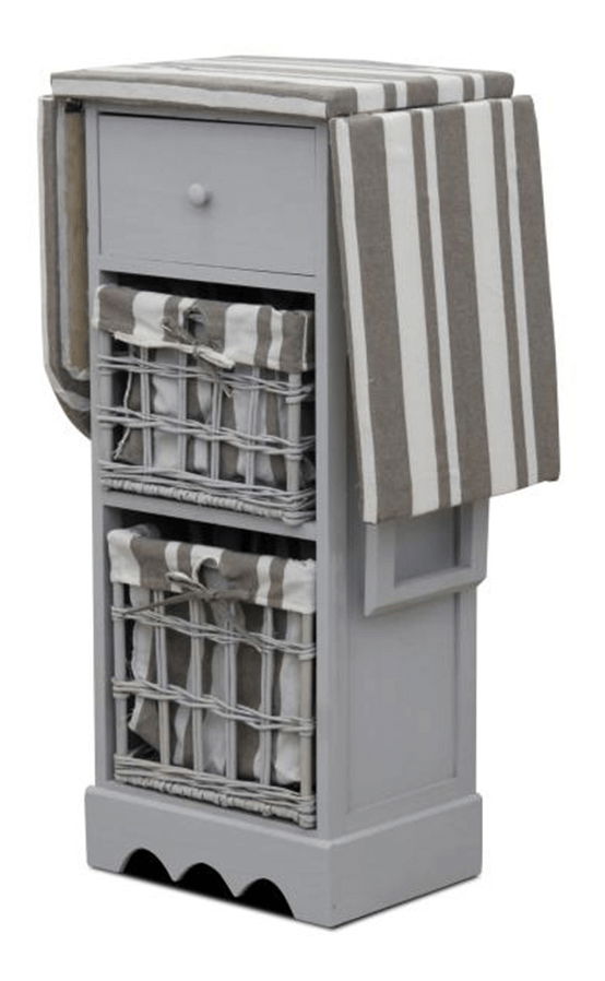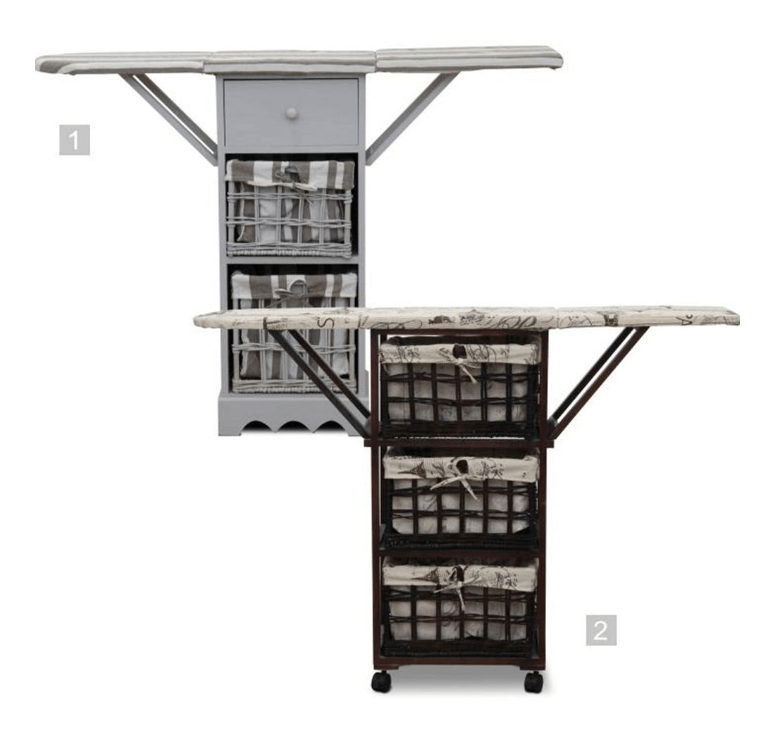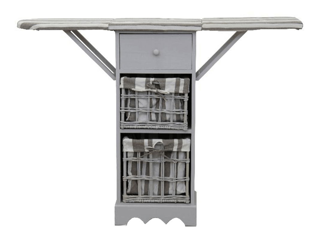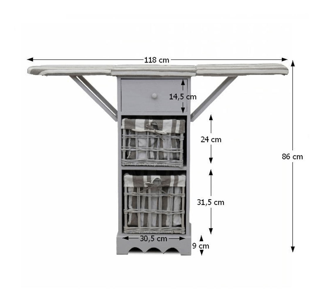 Ozdobná žehlicí prkno rustikálního charakteru, která má pevný dřevěný rám, dva proutěné košíky na odkládání drobností a menší zásuvku s malým kulatým úchytem. Žehlicí prkno se dá i sklopit. Barevné provedení žehlícího prkna je šedá.